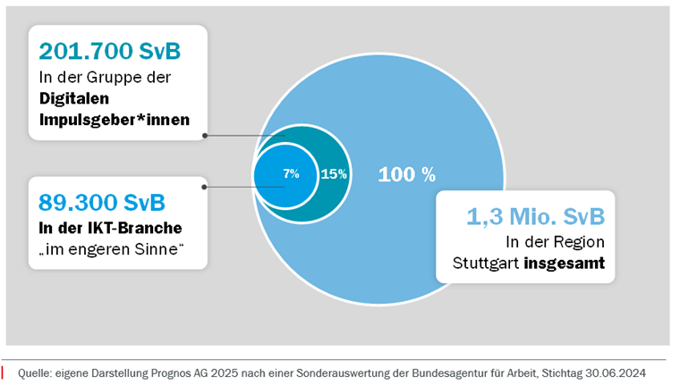 Nach Definition von Prognos umfasst die Gruppe der „Digitalen Impulsgeber*innen“ 89 Berufsgruppen, deren Tätigkeiten die Digitalisierung in unterschiedlichen Wirtschaftsbereichen vorantreiben und umsetzen. Integrierte Berufsgruppen umfassen beispielsweise Informatiker*innen, Produkt-Designer*innen, Gestalter*innen für visuelles Marketing oder Ingenieur*innen der Automatisierungstechnik. In dieser Gruppe arbeiten etwa 201.700 SvB (vgl. Prognos AG 2025, nach einer Sonderauswertung der Bundesagentur für Arbeit 2024). Damit stellen sie rund 15 % aller Beschäftigten in der Region Stuttgart dar.