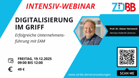 Im Webinar erfahren Sie, wie Sie mit Enterprise Architecture Modelling (EAM) Ihre Unternehmensstrategie und IT-Landschaft optimal verzahnen. Lernen Sie, digitale Potenziale gezielt zu nutzen, Prozesse zu verbessern und fundierte Entscheidungen für die Zukunft zu treffen – praxisnah und umsetzbar für Unternehmen jeder Größe. Die WRS ist Netzwerkpartnerin des ZD.BB.