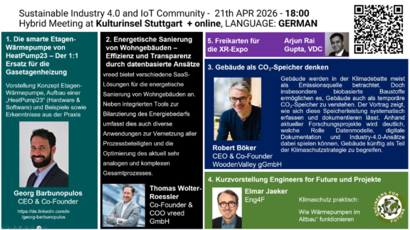 - Vortrag 2: Energetische Sanierung von Wohngebäuden – Effizienz und Transparenz durch datenbasierte Ansätze (Speaker: Thomas Wolter-Roessler, Co-Founder & COO vreed GmbH)