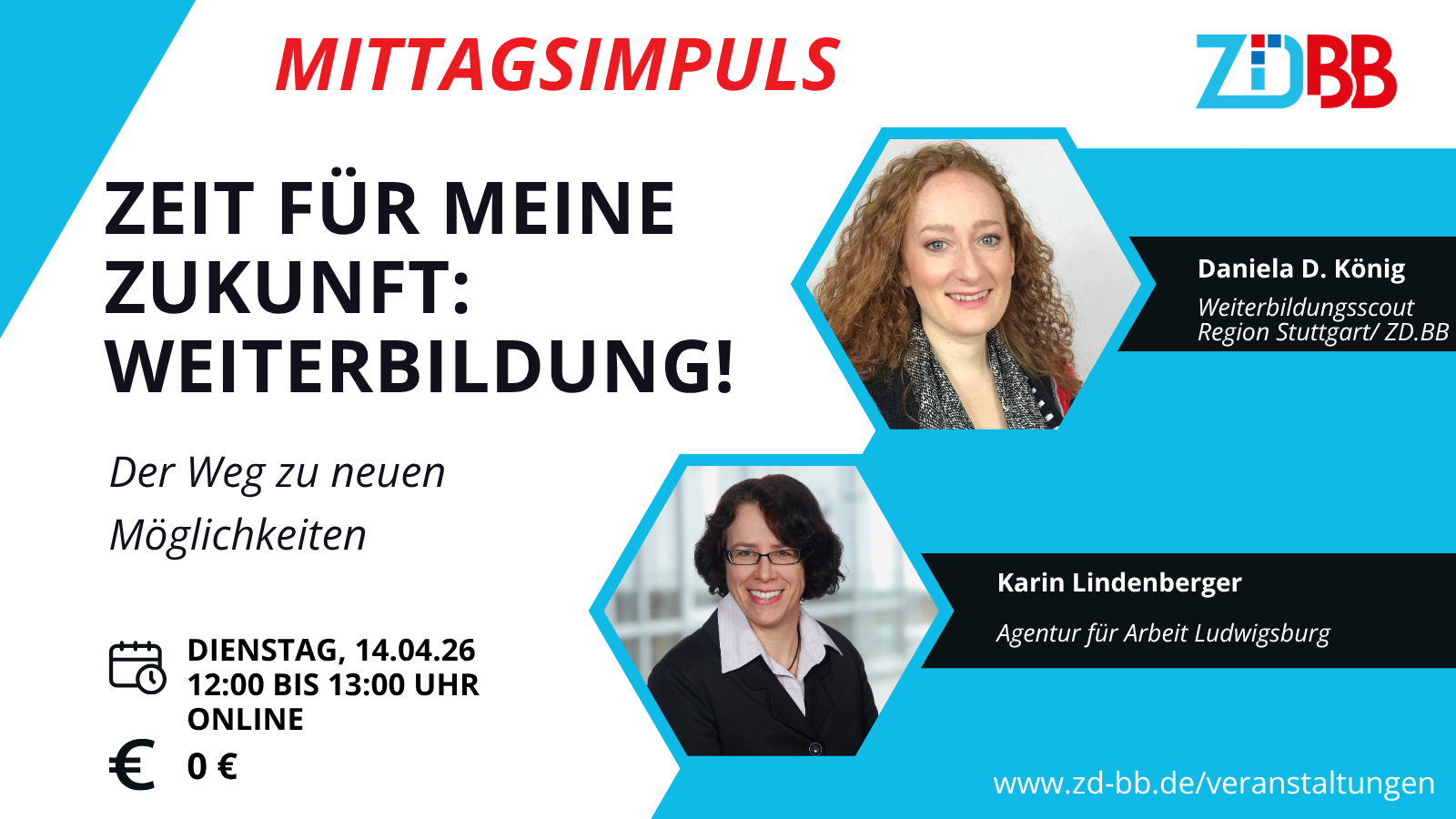 Sie stehen im Job, bei der Arbeitssuche oder beim Wiedereinstieg in den Beruf vor Herausforderungen? Sie überlegen, ob eine Weiterbildung hilfreich sein könnte? Dann sind Sie bei unserem Mittagsimpuls mit den Schwerpunkten Weiterbildung, wichtige Internetplattformen, Beratungsangebote und finanzielle Förderung genau richtig.